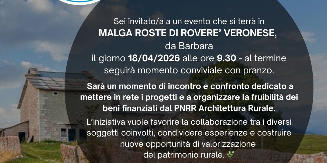 Si terrà sabato 18 aprile 2026 ore 9:30 a Malga Roste a Roverè Veronese, il Convegno su PNRR architettura rurale di alcuni progetti realizzati nell’area Veronese.
